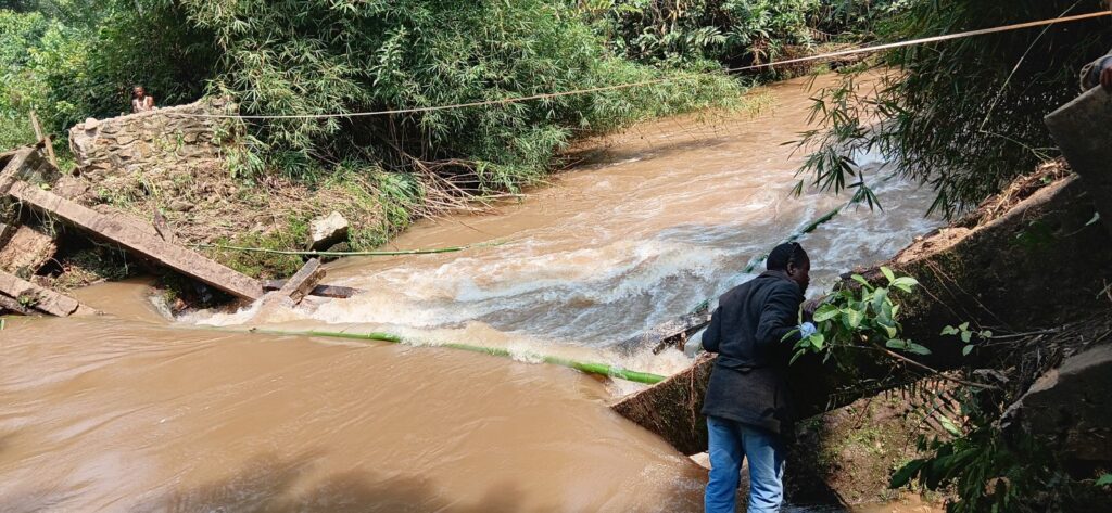 Als die Wambuti aus demDorf fliehen mussten, wurden die Stützen entfernt und die Rebellen und Soldaten sind mit schweren Motorrädern darüber geprescht. Sie hing schon durch, was das für die Motorräder noch interessanter machte. Jetzt liegt sie im Fluss.